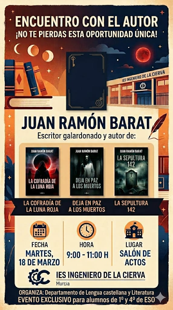 En el IES Ingeniero de la Cierva hemos organizado un encuentro con el autor Juan Ramón Barat, escritor galardonado y autor de La cofradía de la luna roja, Deja en paz a los muertos y La sepultura 142, para compartir con nuestro alumnado una charla sobre su obra y la literatura. Será el martes 18 de marzo, de 9:00 a 11:00 h, en nuestro salón de actos, y es un evento exclusivo para estudiantes de 1º y 4º de ESO, coordinado por el Departamento de Lengua Castellana y Literatura.