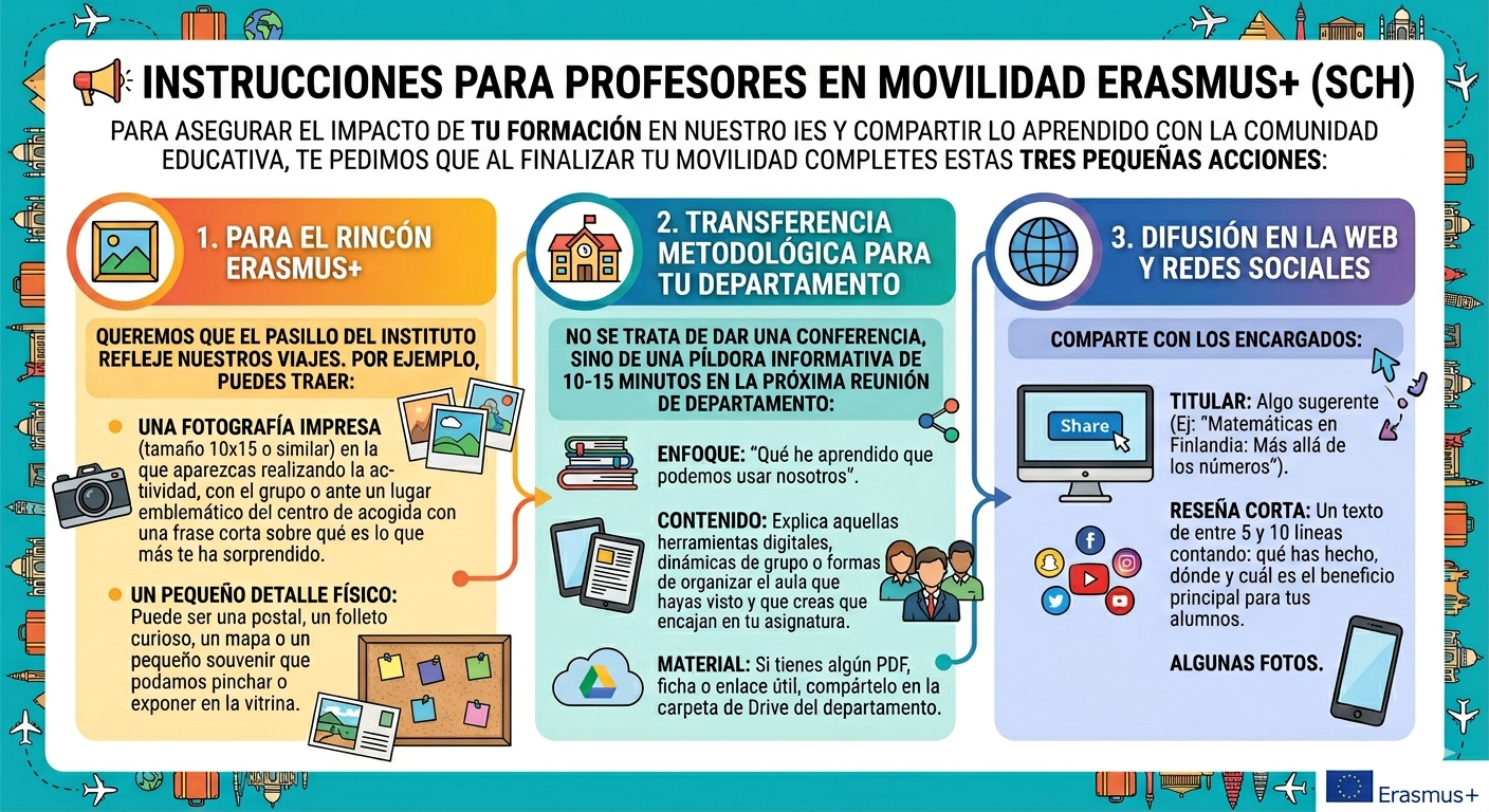 Los profesores deben comprometerse a la búsqueda de la actividad que desean realizar, enmarcada en el proyecto que se está llevando a cabo, así como a realizar un informe final y a compartir sus experiencias con el resto de la comunidad educativa.