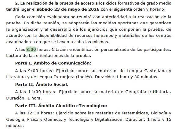 Sábado 23 de mayo (Día de celebración de la prueba de acceso en el centro examinador)